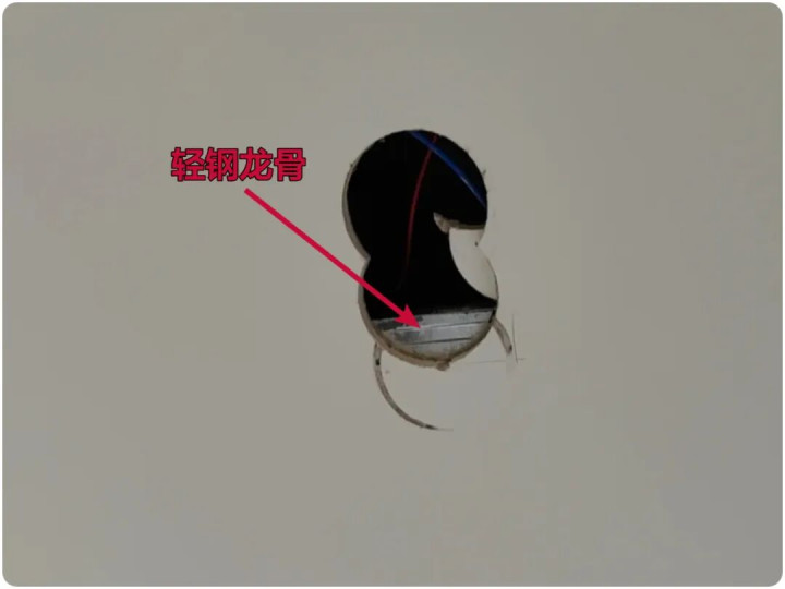 ▲①木匠吊顶时,就会研讨龙骨躲闪灯孔位置,根源上不糟塌龙骨结构。