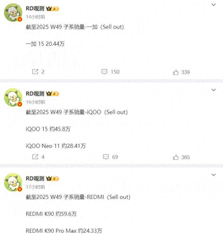 12月14日行业东谈主士“RD不雅测”提供了为止W49周,也即是12月6日。子系三个品牌REDMI、iQOO、一加在10月份傍边发布的两款新机的最新销量。从全体上来看这三个子系品牌的花样照旧没变,底下沿途来望望。