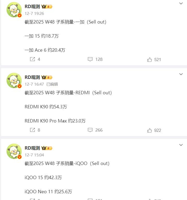 现时对比“RD不雅测”在12月7日提供的为止W48周的数据,咱们来算算这些机型的周销量齐是几许。REDMI K90 Pro Max在W49周销量约为1.33万台,REDMI K90的销量约为5.3万台;iQOO 15在W49周的销量约为3.5万台,iQOO Neo11的销量约为2.81万台;一加15在W49周的销量约为1.74万台,一加Ace 6的销量约为2.76万台。合在沿途REDMI K90系列周销量约为6.63万台,iQOO的两款机型销量约为6.31万台;一加两款机型的周销量约为4.5万台。看似照旧REDMI K90系列销量最高,但iQOO两款机型依然追上来了,且这周一加15的销量是大于REDMI K90 Pro Max的。