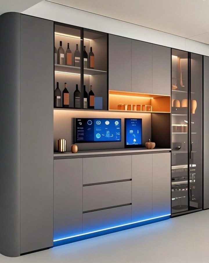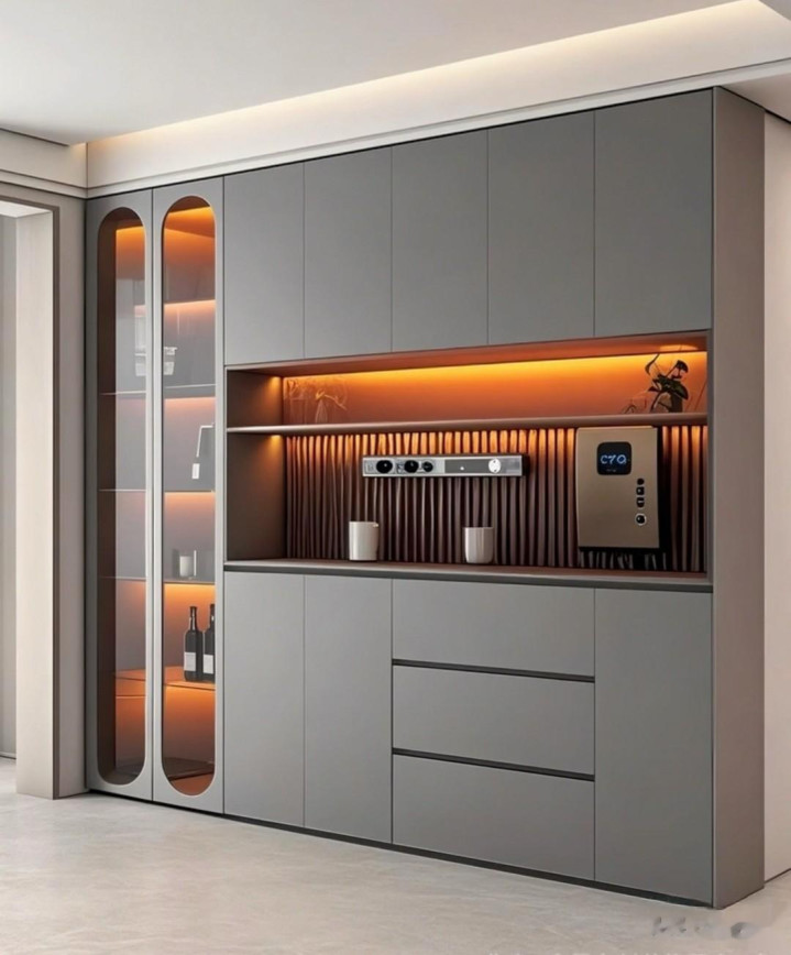 浅灰在冷热光晕的反衬下,显得气派高尚,浅灰与玄色铝框玻璃门的反差,突显出满满的高等感,智能家庭操控面板,进步了餐边柜的前卫感。