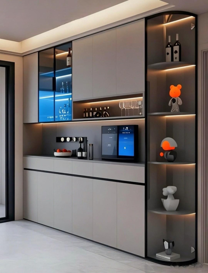 仅这两扇高端大气的圆形玻璃门,就能让东谈主馋涎欲滴,无意一望普遍的空格部位,在灯带的映射下,暖光晕染了氛围,容貌进步了颜值。