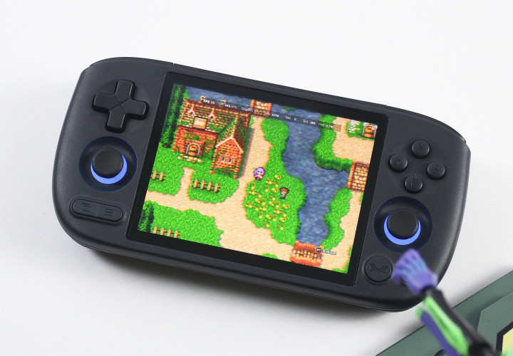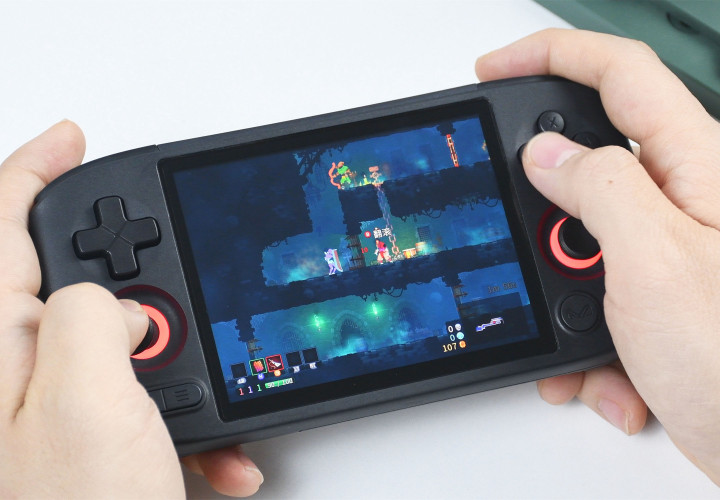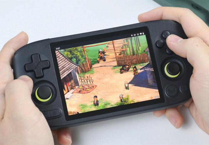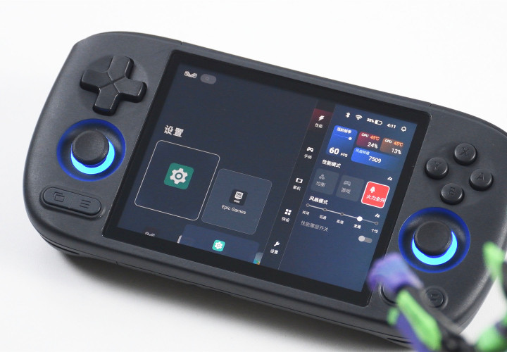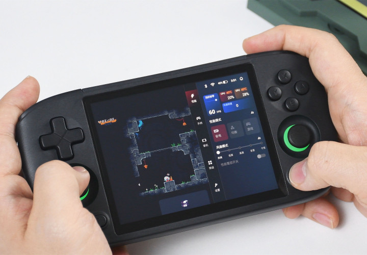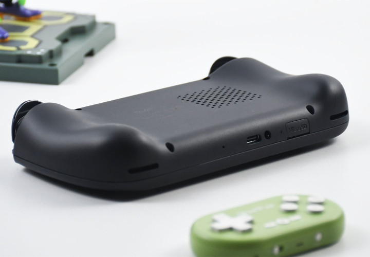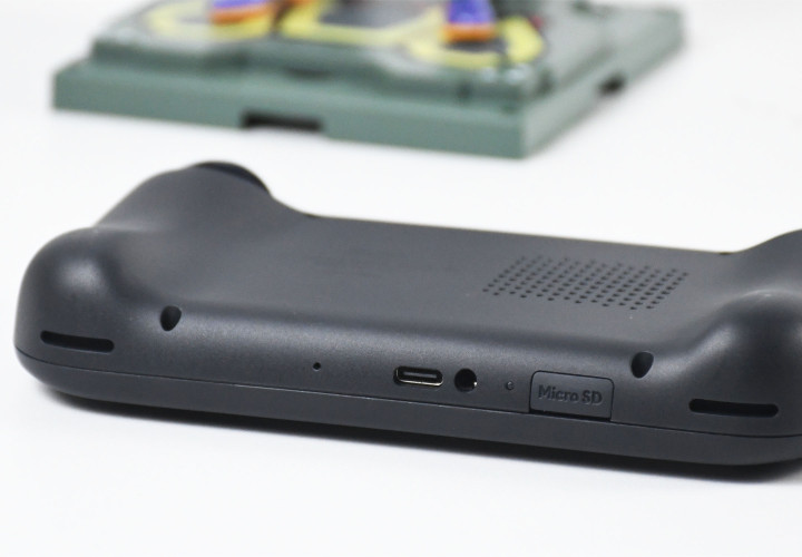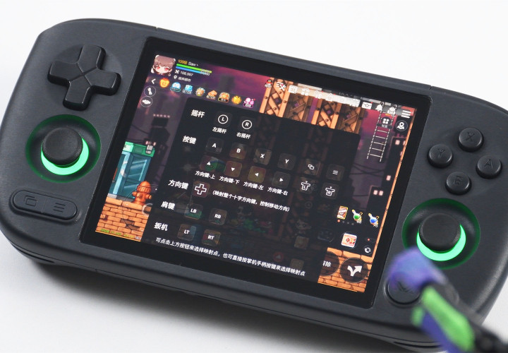 这台安卓游戏掌机的A/B/X/Y键以及十字按键均为导电胶材质,手感还行,回弹比拟快。摇杆为下千里式打算的霍尔中摇杆,但由于整机尺寸比拟小,正面的按键跟摇杆之间的距离比拟近,是以操作按键时,指腹部分位置会被摇杆遭逢。